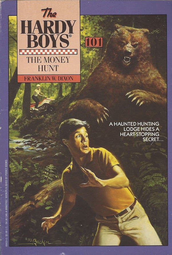 One thing Franklin W. Dixon has never before tried to pull off as a threat to the Hardys was a deer, but that happens in Money Hunt. After recovering from the bear attack, the Hardys and Biff find Chet tied to a tree, with a buck with a “magnificent rack” (121) standing near him. (The buck is described as a six-pointer; I’m assuming the writer is from a state that counts only one side of the rack, which means the deer could have also been described as a more impressive 12-point buck.) Fortunately, the Hardys, Biff, and the Ackerlys frighten it away by using the advanced wilderness technique of “moving closer.” Before it flees, everyone except Fletcher and Peters gathers around, lured by what is evidently the only deer in Maine. Pooling mental resources, they figure out Peters is the remaining bank robber in heavy disguise.