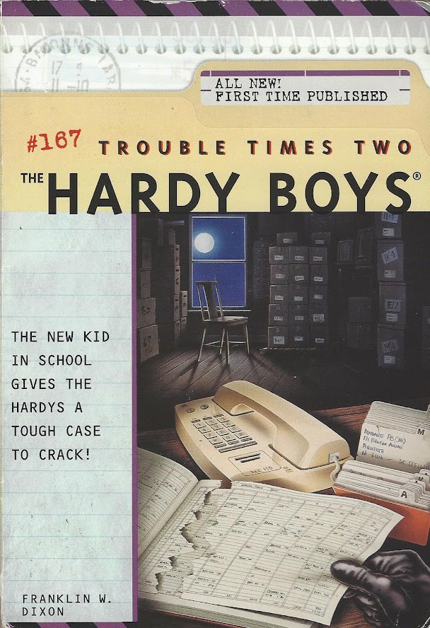 Liz is a character who has slipped beneath my radar, a side effect of my skipping around the canon. Liz first appeared in the early Casefiles as Callie’s friend, but Trouble appears to be her first appearance in the Digests. Liz is also in Kickoff to Danger (#170) and The Test Case (#171), filling the young snoop role one would expect of the daughter of someone in the newspaper game. (Here, she and her father work at the Bayport Gazette; in Kickoff and Test Case, her father is an editor at the Bayport Times, and she works for the school paper, the Beacon. She also reports for the Bayport Cable News in Test Case.) In Test Case, her reporting alienates the Hardys, and — as far as I can tell — she made no more appearances in the series.
